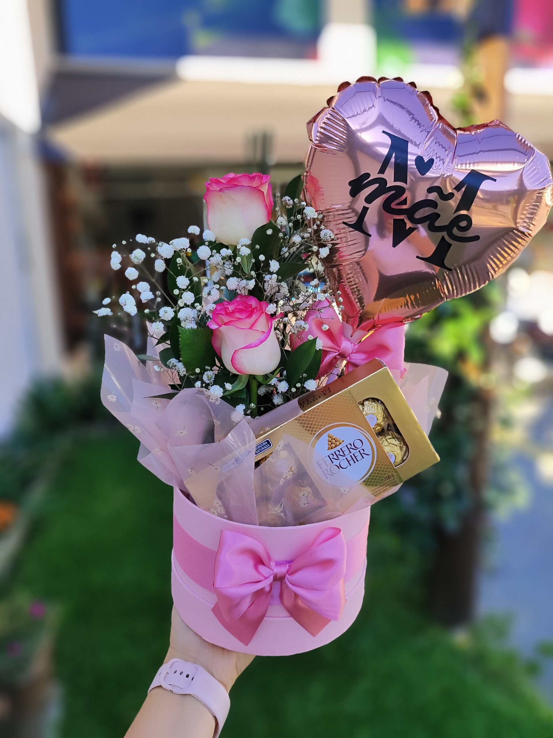 Box composta por um arranjo de 3 rosas, símbolo do amor e da beleza, uma caixa de bombons Ferrero Rocher 100g, e para completar este presente de coração, um balão em formato de coração. Cada detalhe foi pensado para homenagear a sua mãe de uma forma única e memorável.