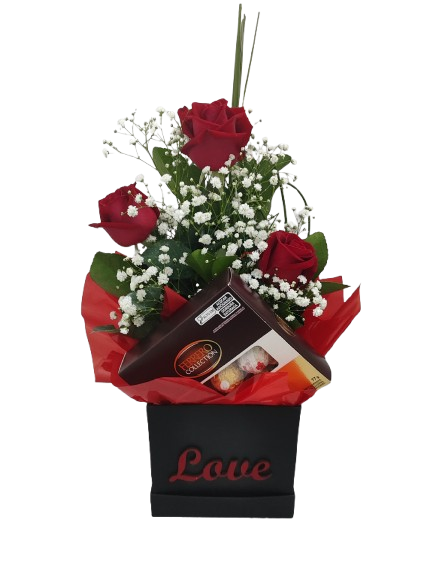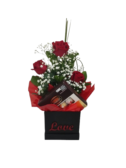 – arranjo com 3 rosas vermelhas mais complementos