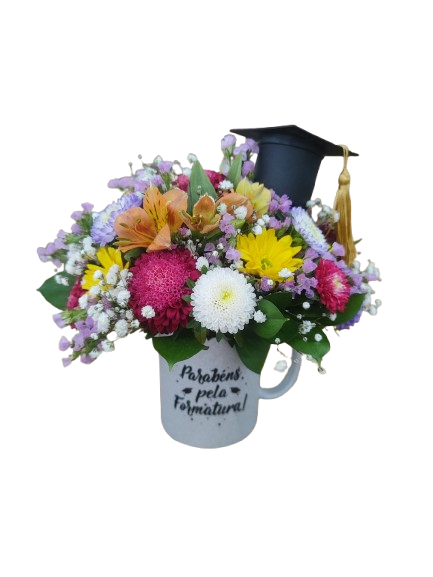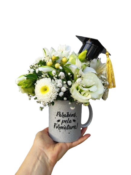 Nossa Caneca de Cerâmica é o presente ideal para homenagear o novo formando. Superfície com glitter e estampada com a frase “Parabéns pela Formatura”, acompanhada de um delicado capelo. E o toque final desse presente é você quem escolhe! Nosso arranjo é composto por um Mix Selecionado de Flores do Campo, que podem ser coloridas ou monocromático. Você pode escolher o arranjo em tons de uma única cor (ex.: todo branco, tons de rosa ou amarelo) ou um arranjo vibrante e alegre, com cores variadas (conforme disponibilidade do dia).