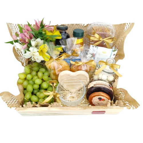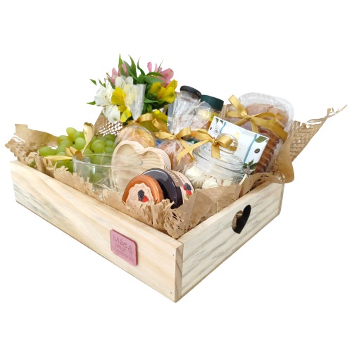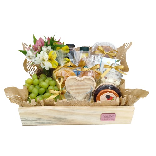 Esta cesta especial traz uma deliciosa combinação de guloseimas e uma xícara de vidro com pires de madeira formato coração e uma linda colherzinha dourada. para que ela possa desfrutar de seus momentos de descanso com todo o carinho. Cada item foi selecionado com o intuito de proporcionar uma experiência única e repleta de afeto.