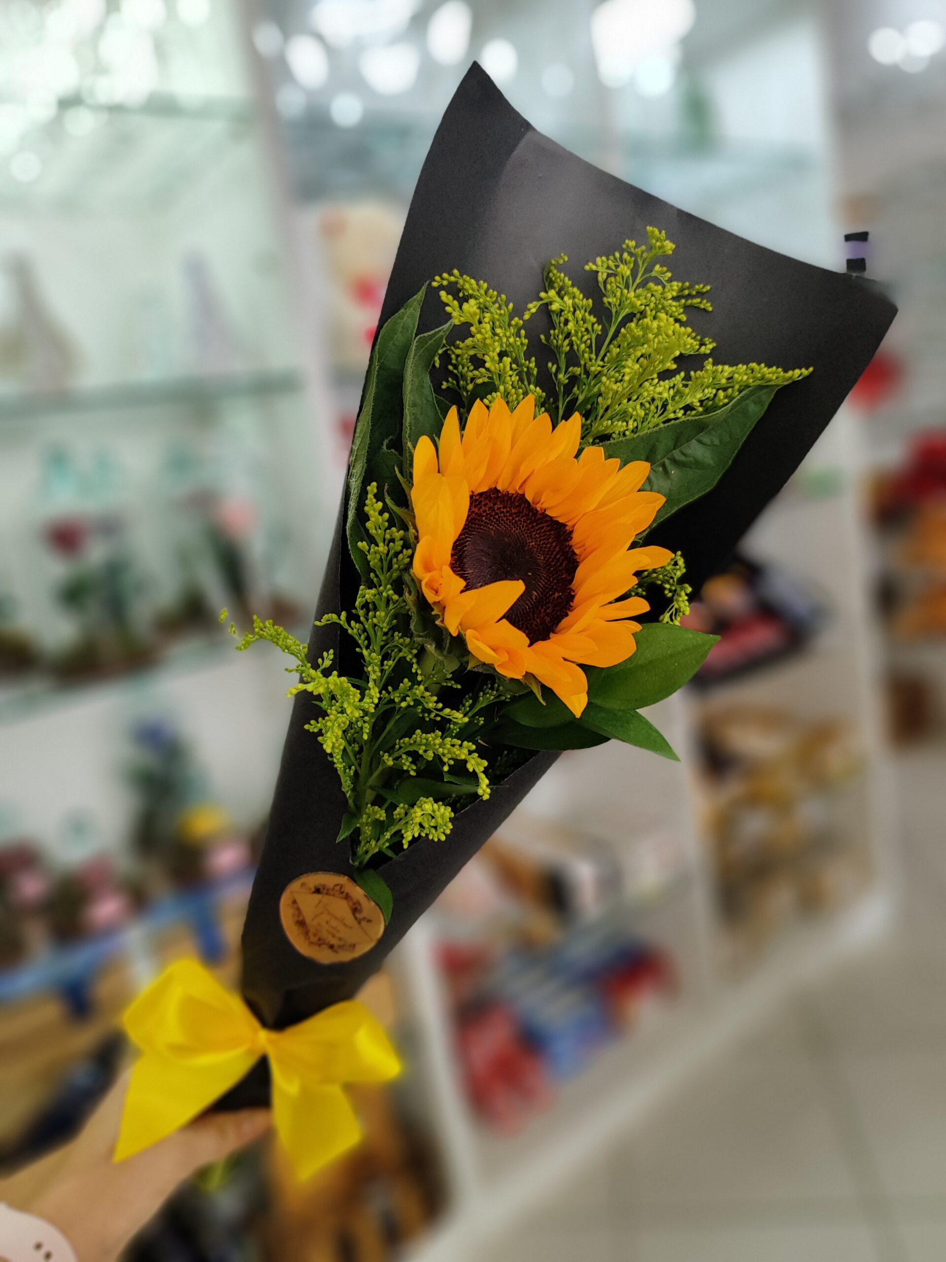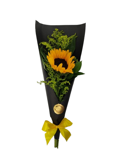 O girassol vai em uma embalagem de papel cartão.